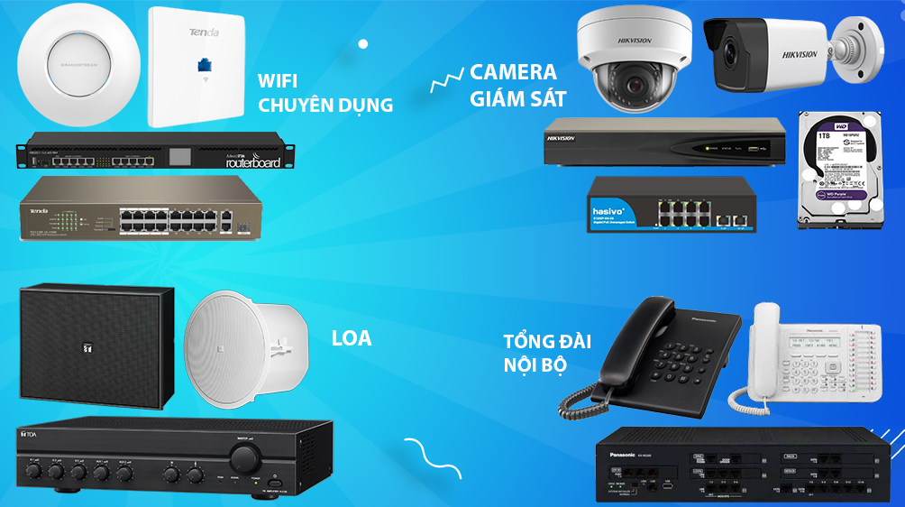 👉 Thiết bị viễn thông: Mạng WiFi, Tổng đài nội bộ, Camera, Loa, Truyền hình